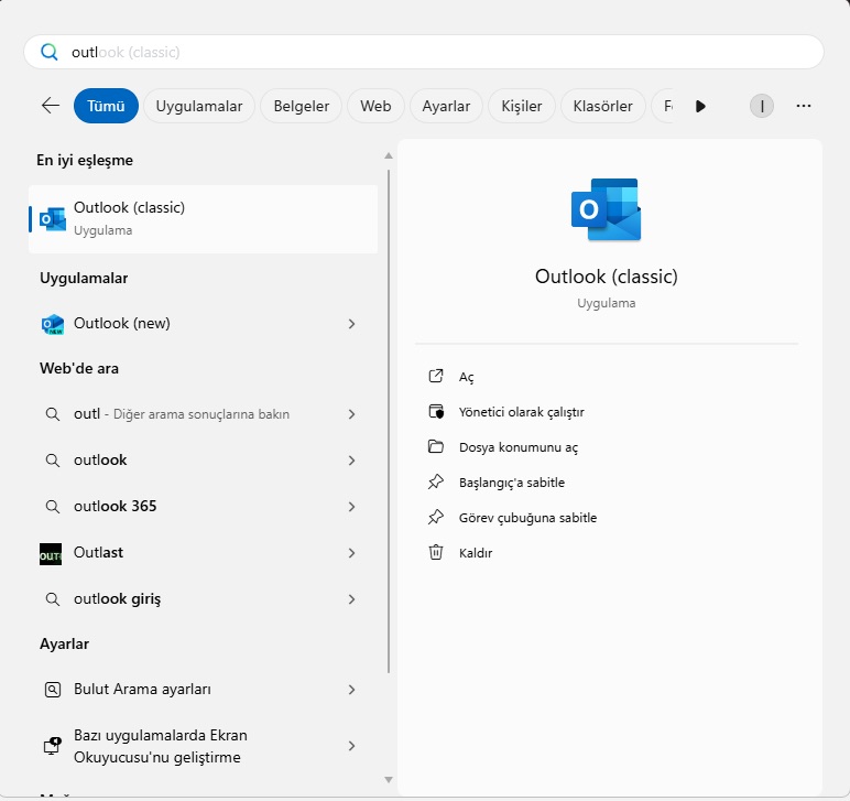Başlat menüsünde "Microsoft Outlook (Classic)" şeklinde aratarak bulabilirsiniz: