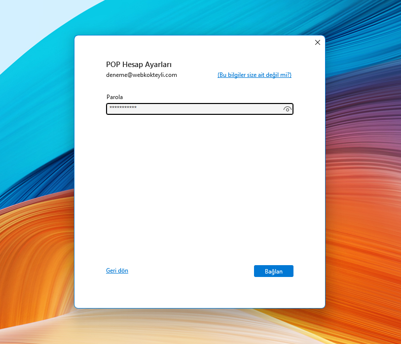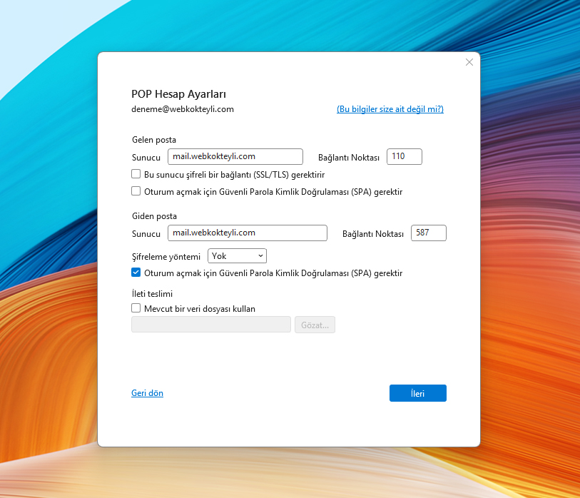 (örneğin info@kumasfirmasi.com için, mail.kumasfirmasi.com olmalıdır.) - Bağlantı noktası: 110