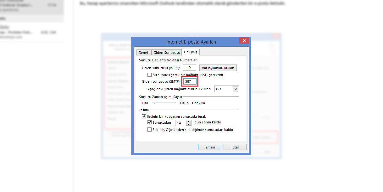 - Giden sunucusu kısmında: 587 yazdığından ve