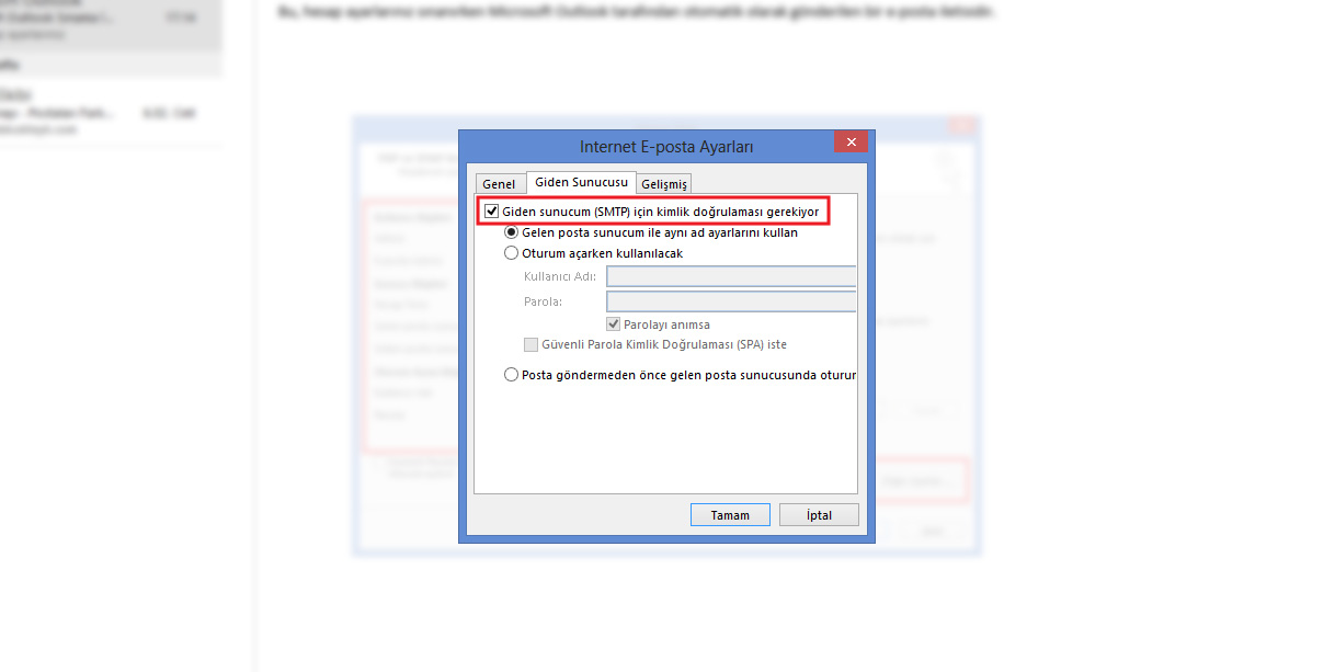 Giden sunucum (SMTP) için kimlik doğrulaması gerekiyor seçeneğini işaretleyin.