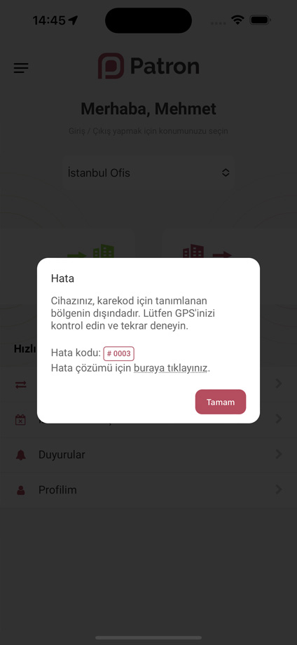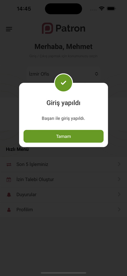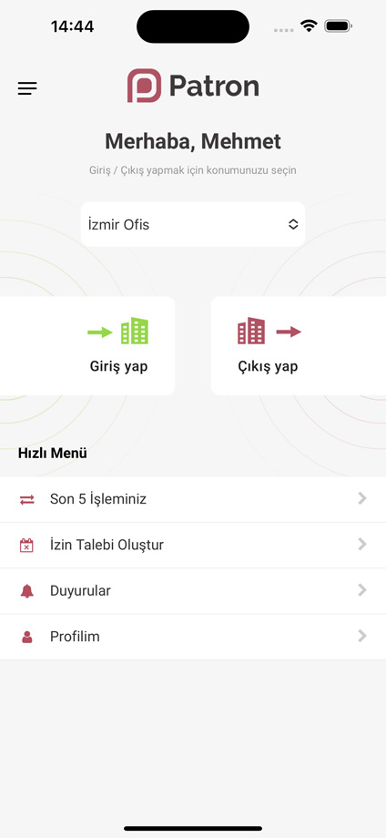 Yeni nesil PDKS - Personel Devam Kontrol Sistemi olan Patron, kullanıcıların akıllı telefonları dışında hiçbir cihaz, donanım ve yazılım gerekmeksizin, dakikalar içinde işletme personelinin giriş-çıkış zamanlarının kayıt altına alınması ve günlük / haftalık / aylık rapor oluşturulmasını sağlayan web tabanlı bir uygulamadır.