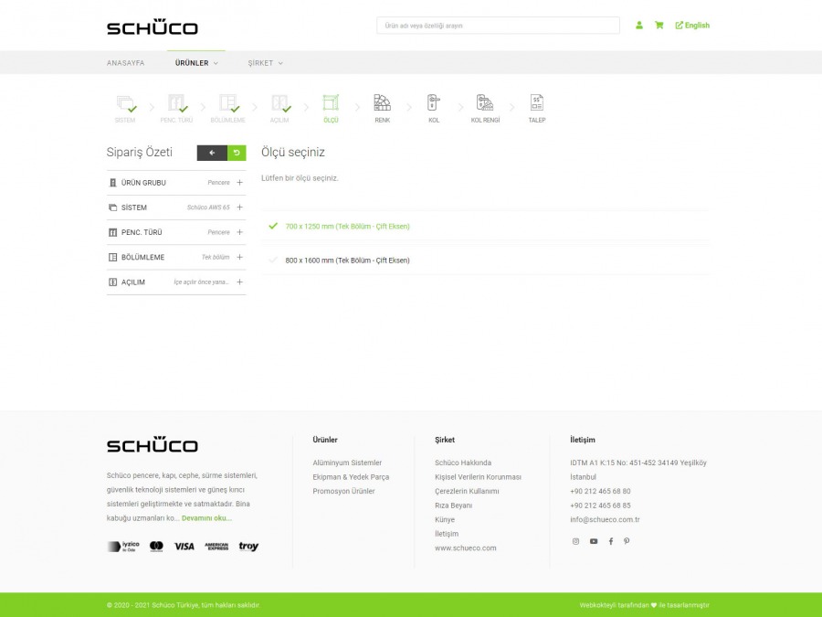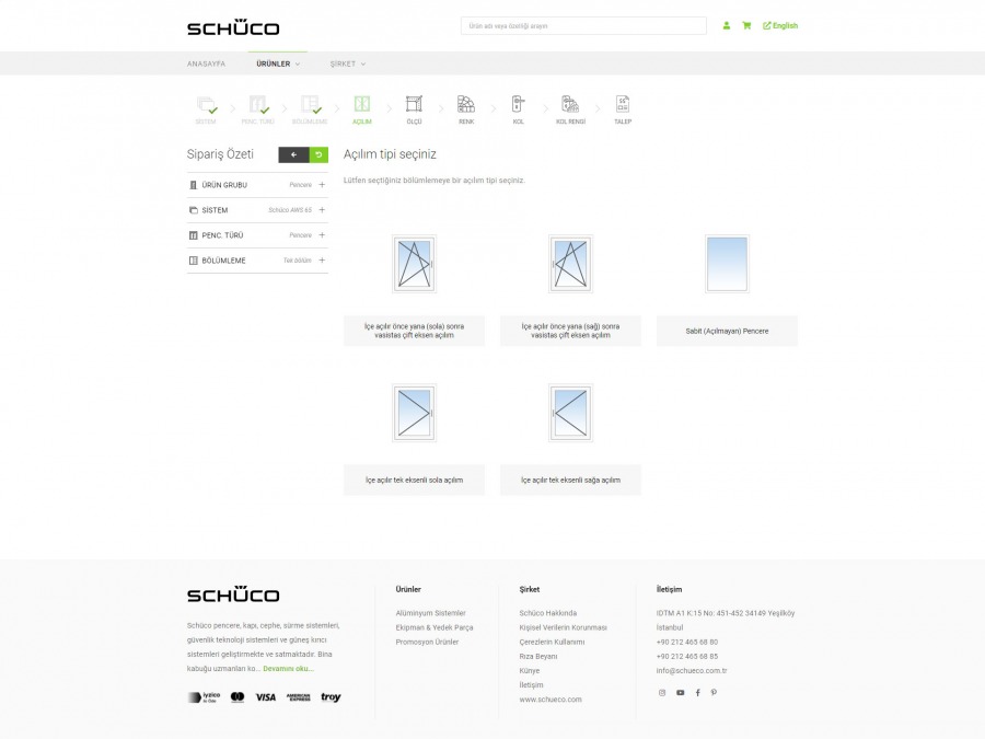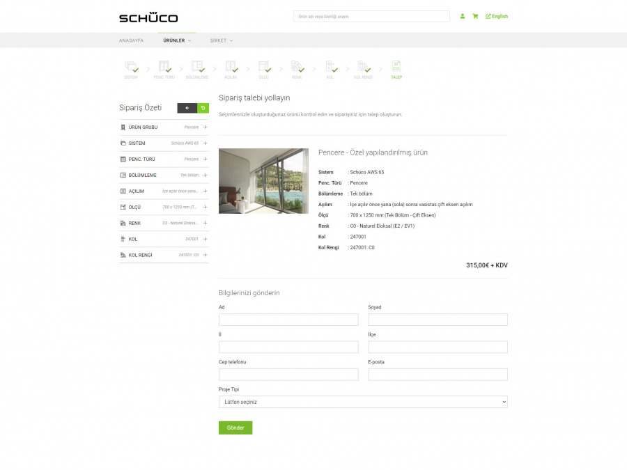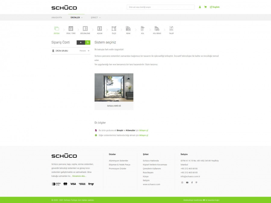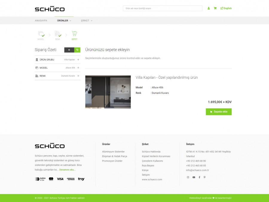 Schüco Türkiye alüminyum sistemler ürün yapılandırıcı (konfigüratör) yazılımı tamamlandığında, sistemin e-ticaret yazılımına entegrasyonu yapıldı. Bu proje için özellikle hazırlanan ve özelleştirilen e-ticaret yazılımımız ile yapılandırıcı yazılımı Schüco Türkiye'nin tüm isteklerini karşılamak için hazırdı.